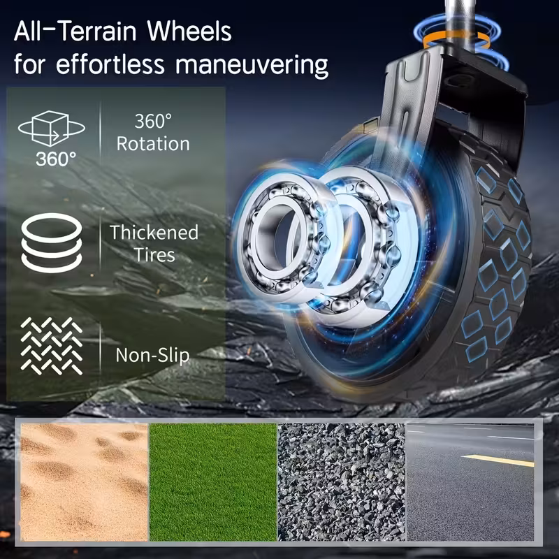 Thickened non-slip wheels handle sand, grass, and gravel with ease.
